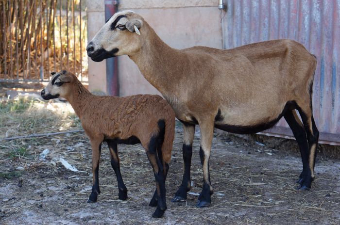 Brebis Barbados Blackbelly et son agneau à la Ferme du Rouvet.